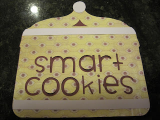 I love how this turned out!  I didn't have any of the cartridges with a jar, so I used George to make a rounded corner rectangle and then I welded one parenthesis from Gypsy Wanderings (I think).  They come in a set, so I hid the other one and then rotated it to make it look like a lid!  I cut two cookie jars, one in patterned paper with the words Smart Cookies cut out and then one in maroon that is just the outline.  I used George again to make the stripes across the jar and the knob at the top for added decoration.  I pieced it altogether and then decided it would be too flimsy as is, so then I adhered it to a piece of cardboard from an empty cereal box.  Now it doesn't flop and curl and it's a lot sturdier!